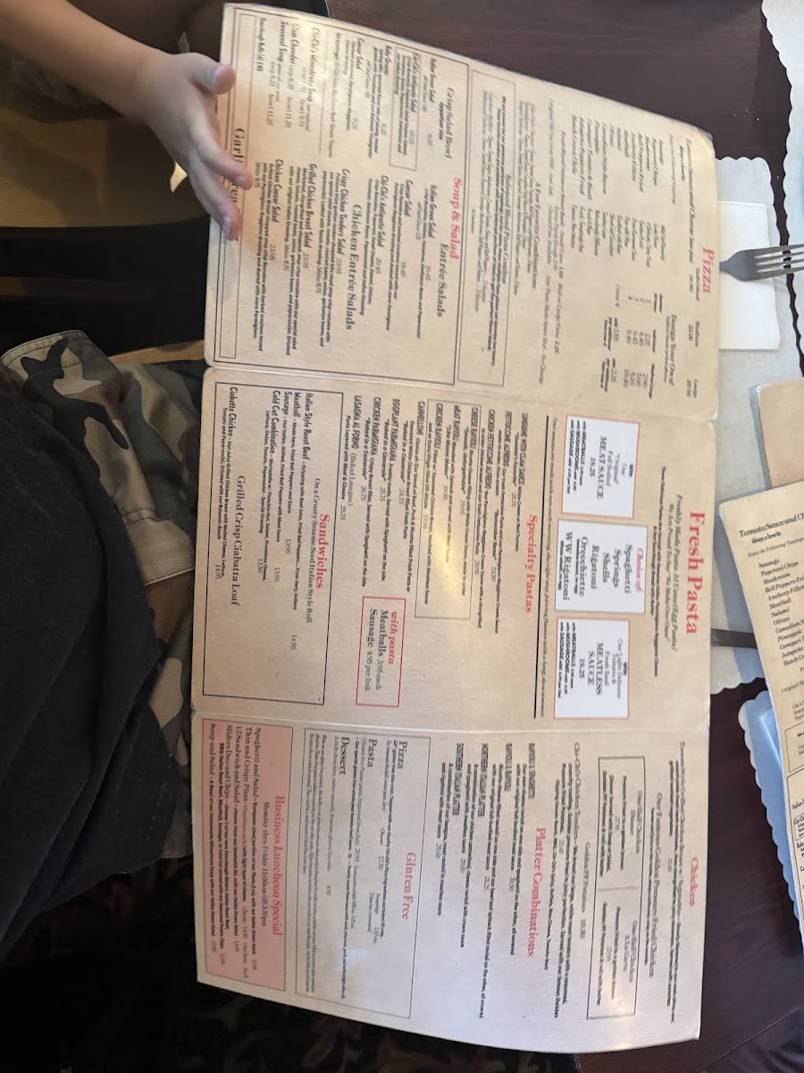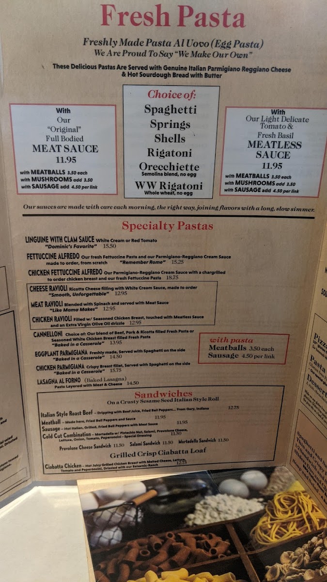 The menu showcases hearty pastas like rich meat sauce spaghetti and creamy fettuccini Alfredo, alongside a variety of pizzas ranging from simple cheese or mushroom options to specialty pies like the Margherita or vegan-friendly choices. Light starters such as antipasto salad and golden chicken wings are perfect for sharing, while mains like chicken or eggplant Parmesan invite a satisfying, comforting meal.